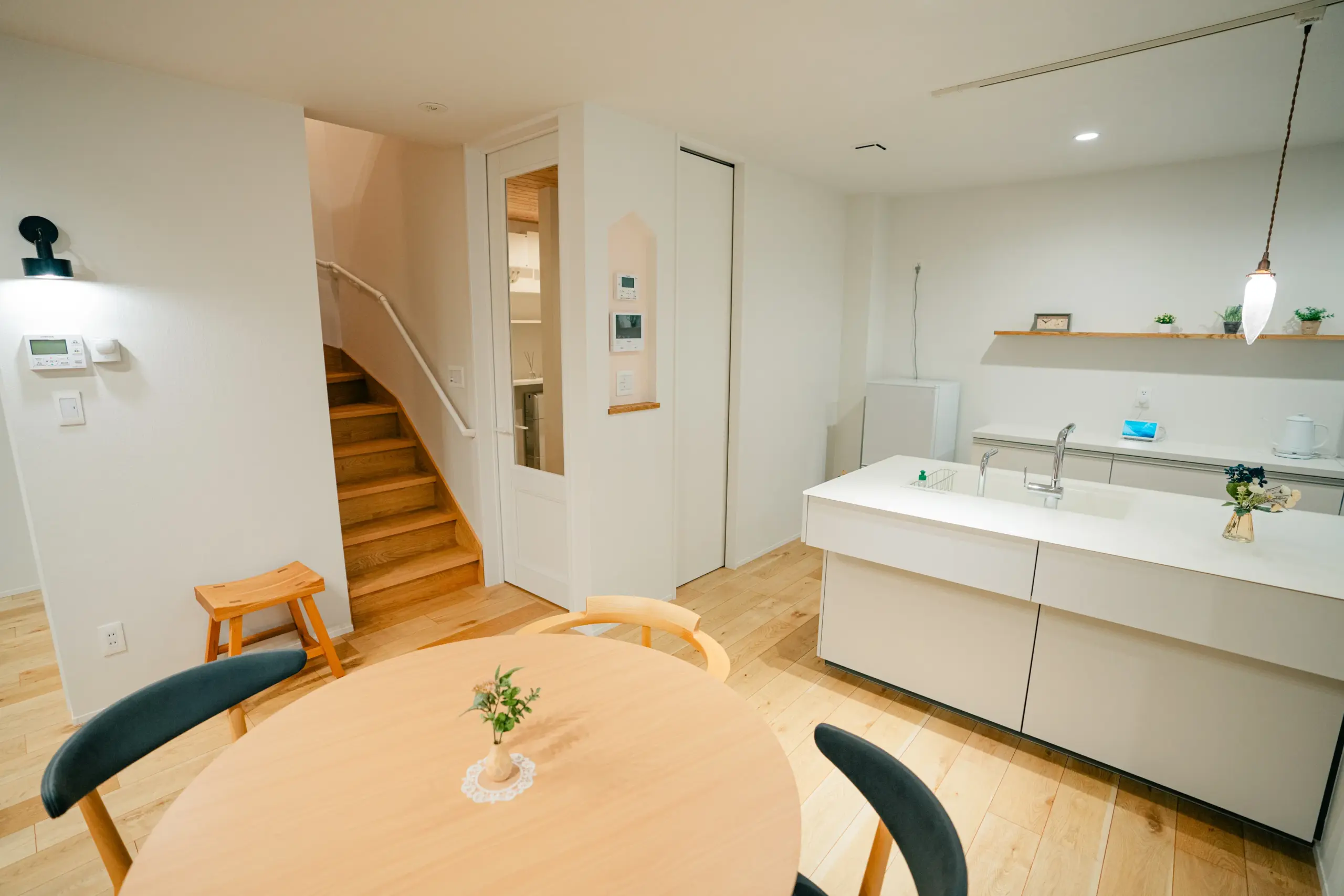 HEAT20G2レベル(北海道2地域におけるUa値0.28W/㎡K)を超える断熱性能を備え、夏は爽やかに涼しく、冬はやわらかな暖かさに包まれる快適な空間。太陽光発電などの創エネ技術も取り入れ、滞在中に使うエネルギーの多くを自給自足できる仕組みを整えています。